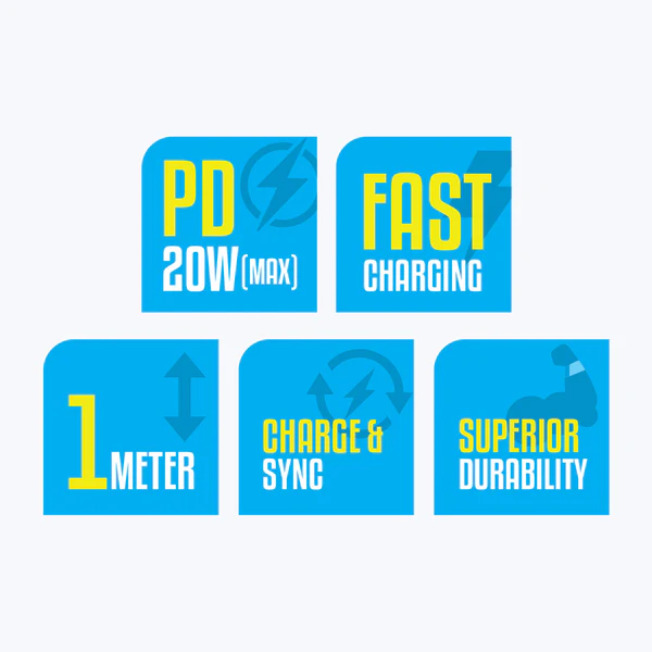 The Zebronics Type-C to Lightning Cable is designed for efficient charging and fast data syncing. With support for 20W Power Delivery (PD), your Apple devices charge safely and quickly.